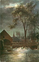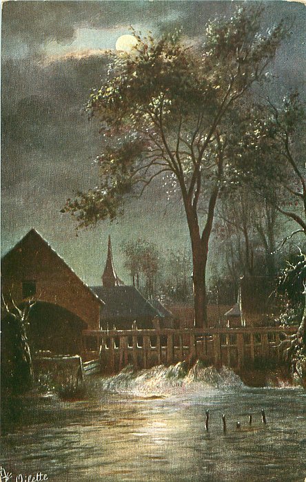 back description:-LE VIEUX MOULIN, AU BORD DE L'EAU PREND AU CLAIR DE LUNE//LA CAMPAGNE