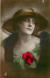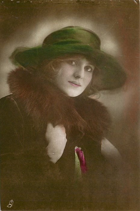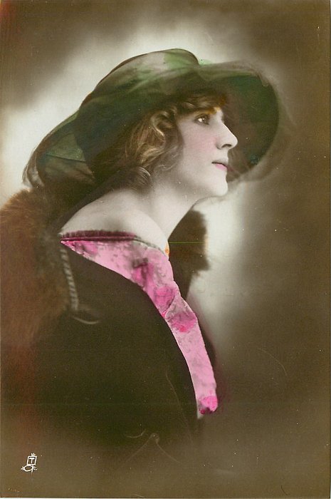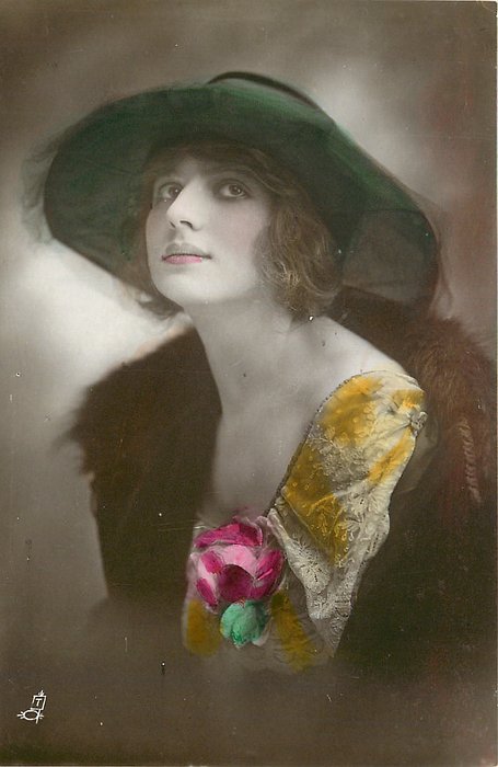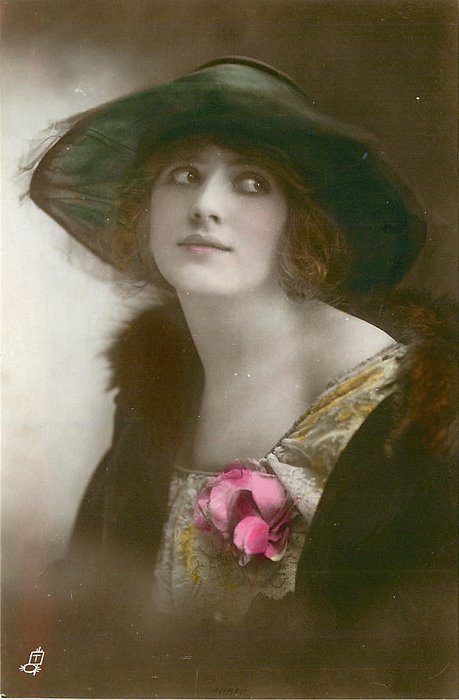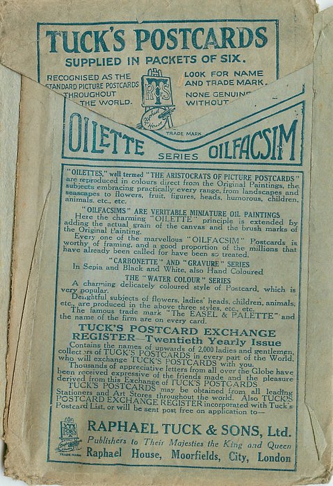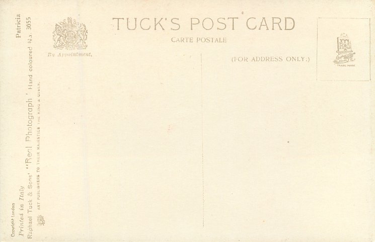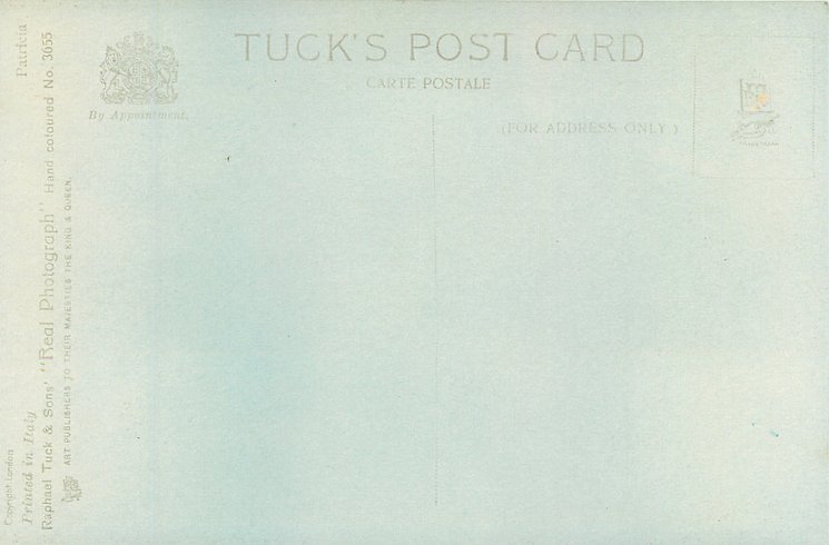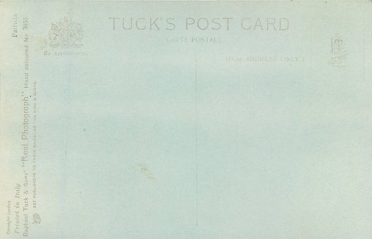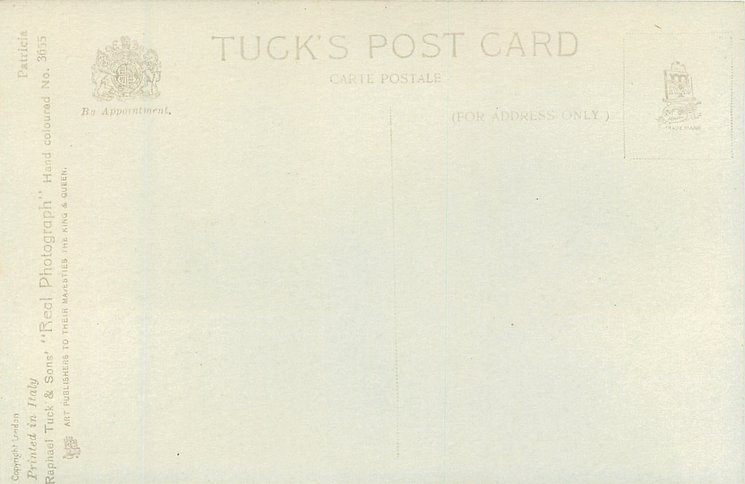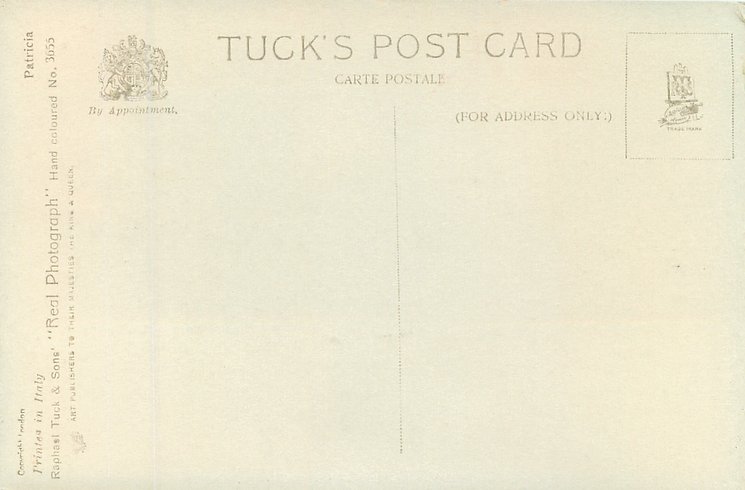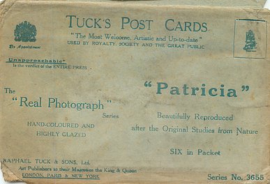 REAL PHOTOGRAPH, PRINTED IN ITALY, COPYRIGHT LONDON, HAND COLOURED, "Patricia" on packet and on card, HAND-COLOURED AND HIGHLY GLAZED