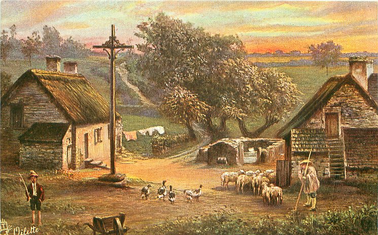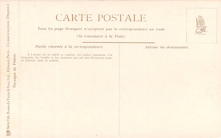back description:- A L'HEURE OU LE SOLEIL SE COUCHE, LES PATRES RAMENENT A LA BERGERIE, LES BREBES ET LE MOUTONS//PRAIRIE