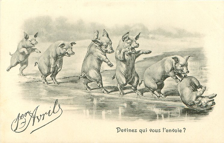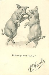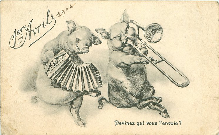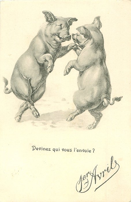 unnumbered, u/b, UN MOT A LA POSTE, (DEPOSE) with international postcard notations upper left on back, come opt. in black 1ER APRIL together with DEVINEZ QUI VOUS L'ENVOIE, grey/black, same images may come French back DEVINEZ QUI 420