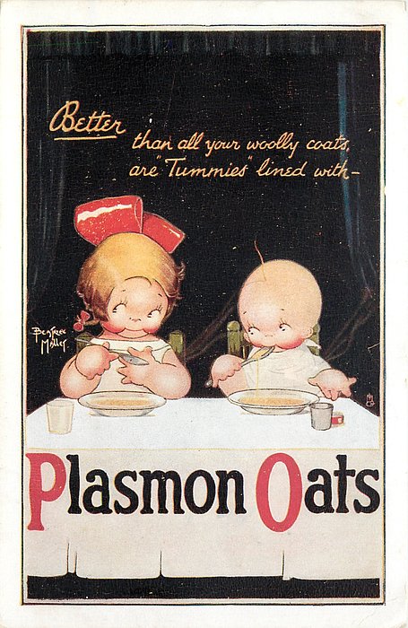 back:- PLASMON OATS IS NOT MERELY A TRADE NAME. IT STANDS FOR THE CHOICEST OATS GROWN IN SCOTLAND, TO WHICH HAS BEEN ADDED PLASMON, THE GREAT NERVE AND BRAIN FOOD. NO OTHER OATMEAL POSSESES THIS ADVANTAGE