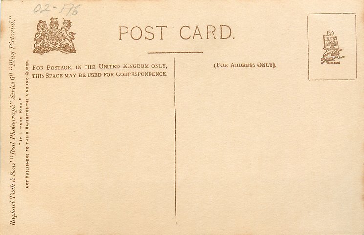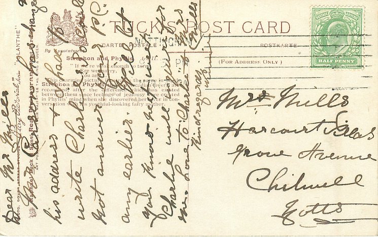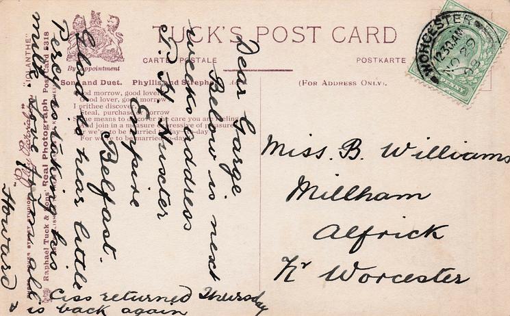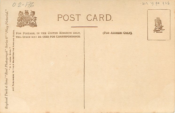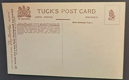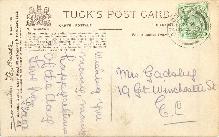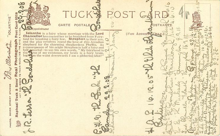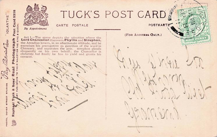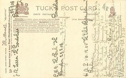 Title on back of card STREPHON AND PHYLLIS with text unclear due to message on card. Clara Dow (1883-1969) At Savoy Th London