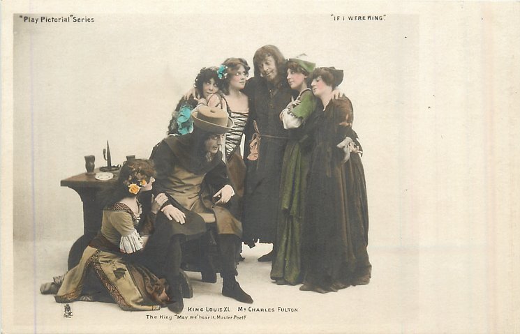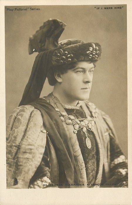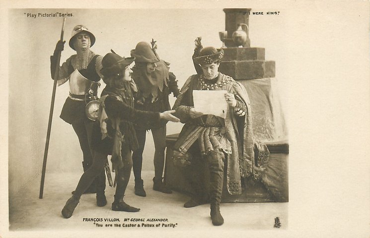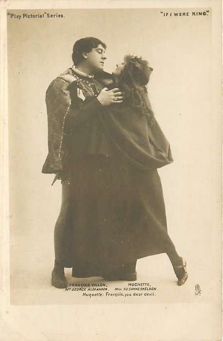 Full text on card front: FRANCOIS VILLON, MR. GEORGE ALEXANDER, HUGNETTE, MISS SUSANNE SHELDON "YOUR VOICE SOUNDS FAMILIAR, MONSEIGNEUR. HAD I EVER THE HONOUR TO SERVE YOU?"