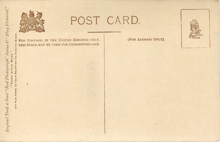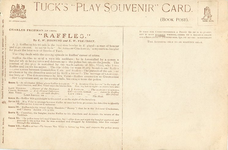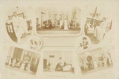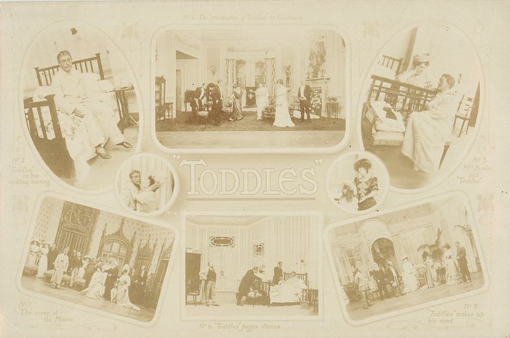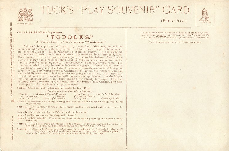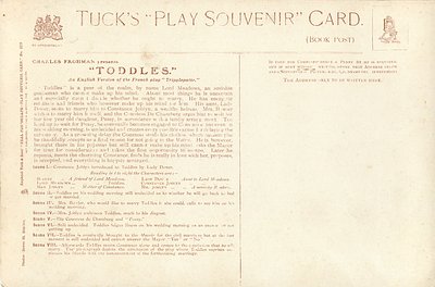 TUCKS "PLAY SOUVENIR" CARD, 22.8 X 15 cm. TODDLES, CHARLES FROHMAN PRESENTS 'TODDLES'. AN ENGLISH VERSION OF THE FRENCH PLAY 'TRIPPLEPATTE REAL PHOTOGRAPH, giant card with much info on back, TUCK'S "PLAY SOUVENIR" CARD (BOOK POST)