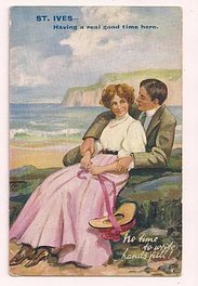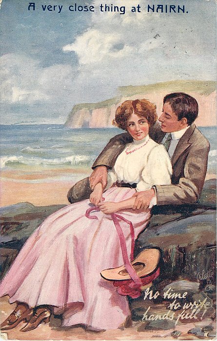comes opt. in blue A VERY CLOSE THING AT NAIRN, in red TO MY VALENTINE, ST. IVES--HAVING A REAL GOOD TIME HERE