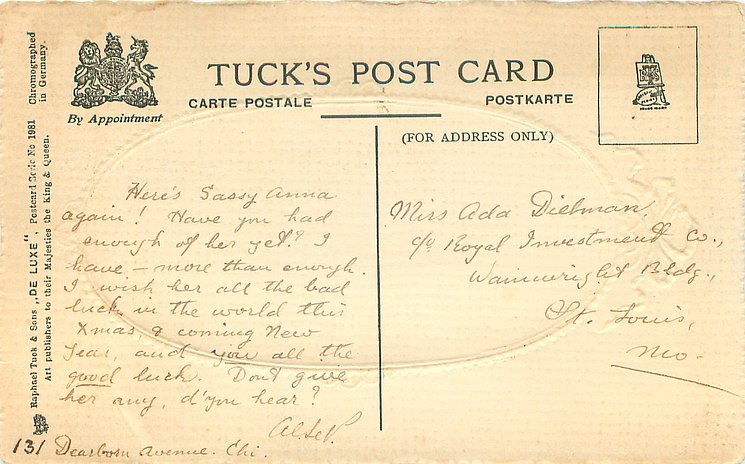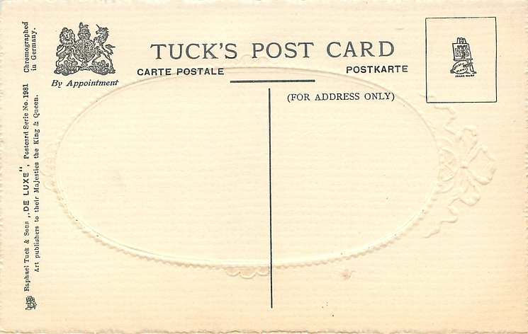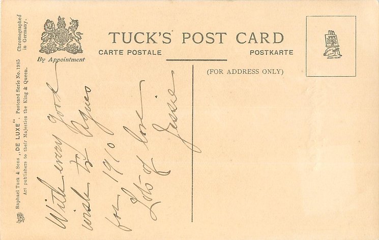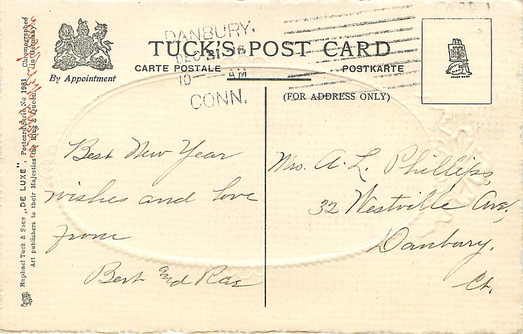 embossed, CHROMOGRAPHED IN GERMANY, all come opt. in red A HAPPY NEW YEAR at base, listed in RAPHAEL TUCK & SONS' LD. CHRISTMAS & NEW YEAR 1904/1905 catalogue