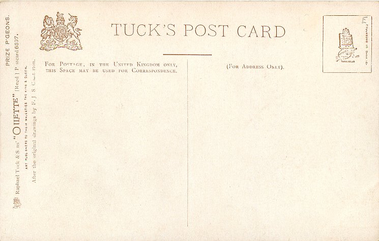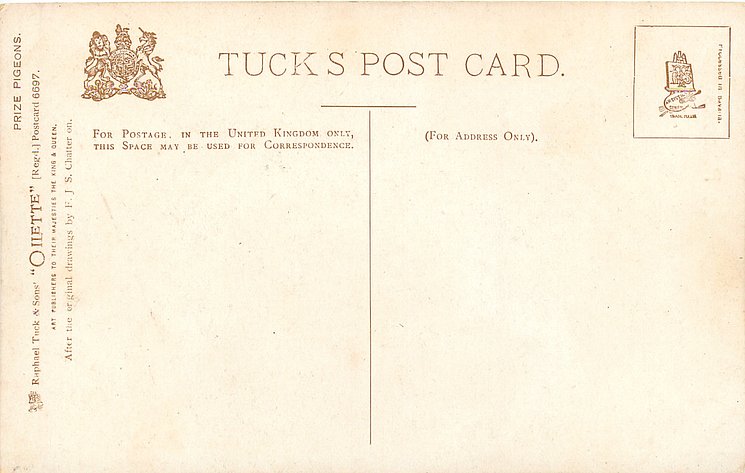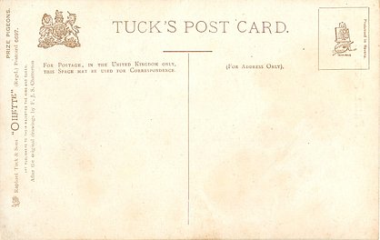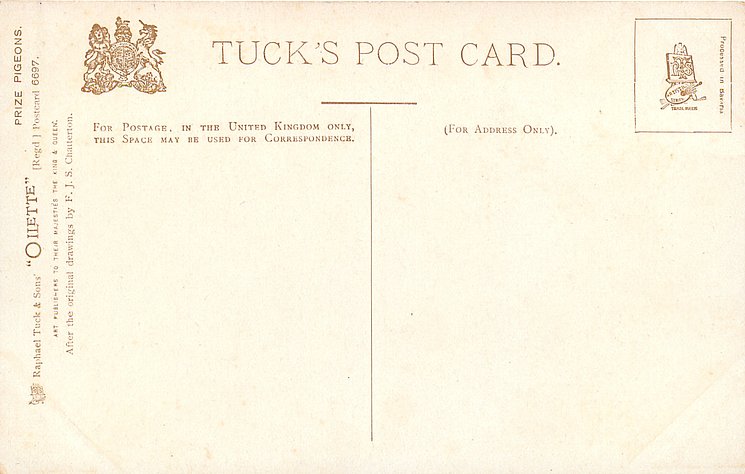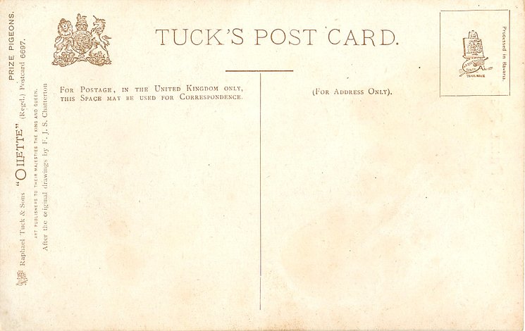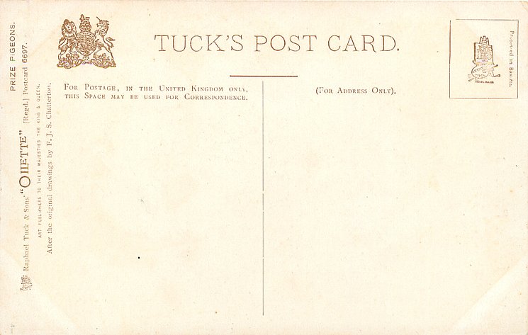 OILETTE, PROCESSED IN BAVARIA (in stamp box), AFTER THE ORIGINAL DRAWINGS BY F.J.S. CHATTERTON, listed in 1908/1909 & 1911/1912 & 1912/1913 POSTCARD Catalogues