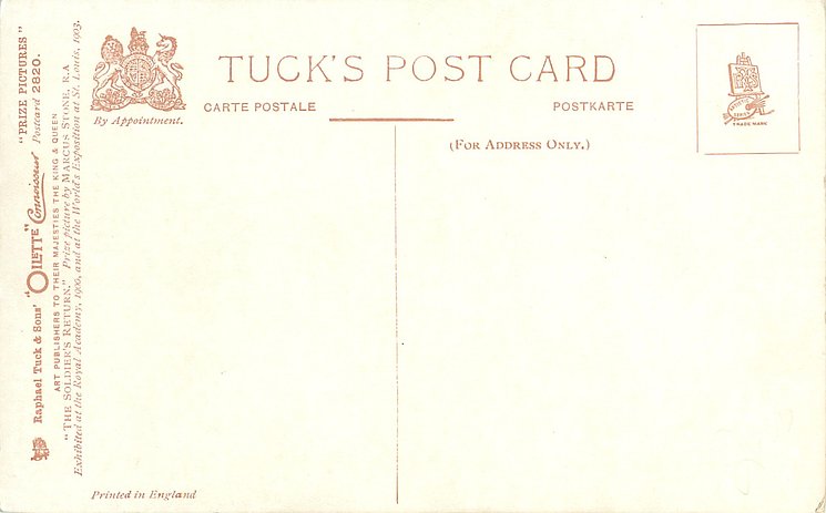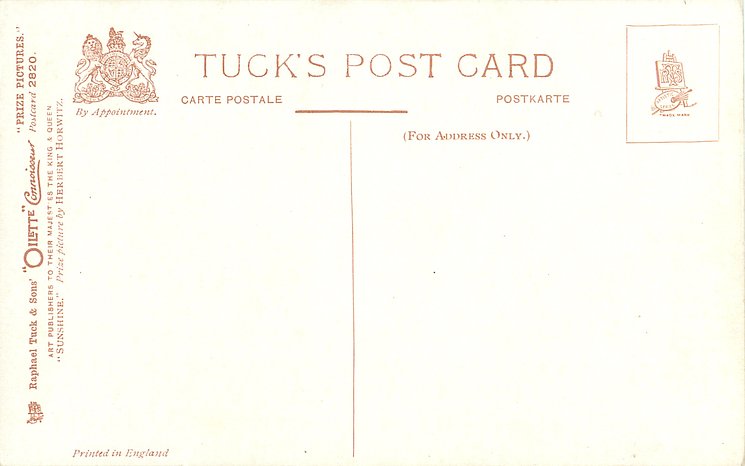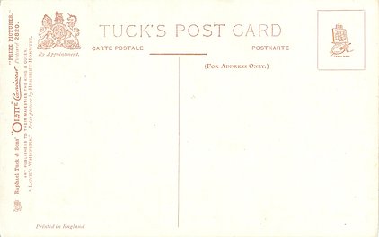 OILETTE CONNOISSEUR, PRINTED IN ENGLAND, EXHIBITED AT THE ROYAL ACADEMY, 1900, AND AT THE WORLD'S EXPOSITION AT ST. LOUIS, 1903, card title on back, listed in 1930 POSTCARD Catalogue, listed in TUCK'S TRAVELOGUES (USA?1905)