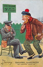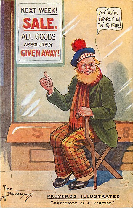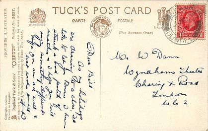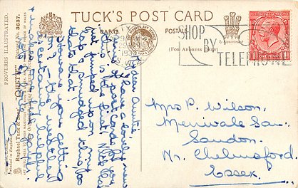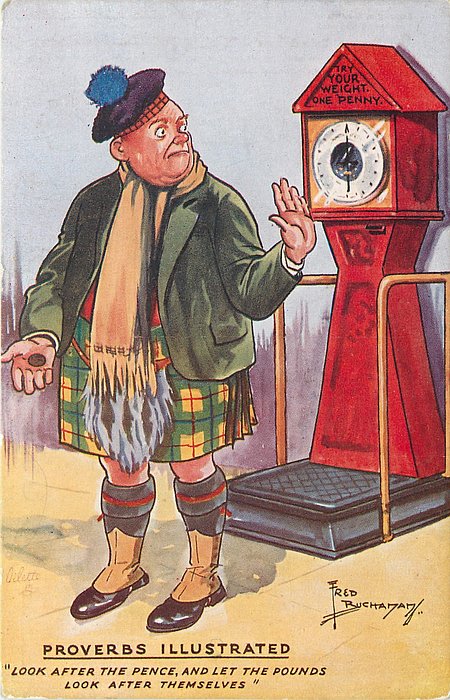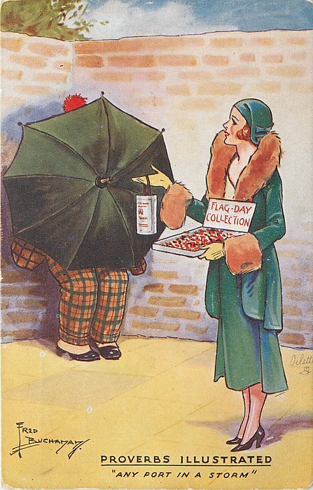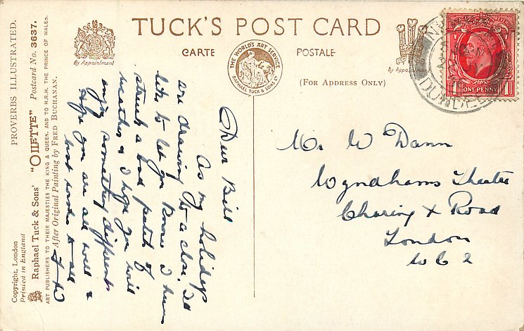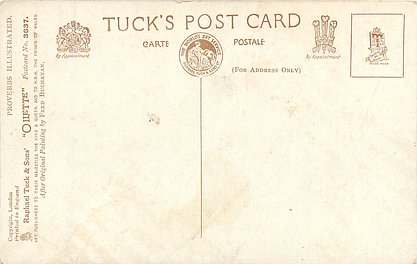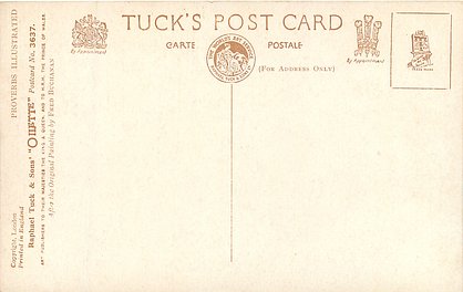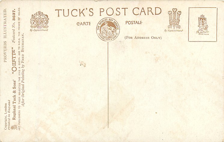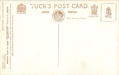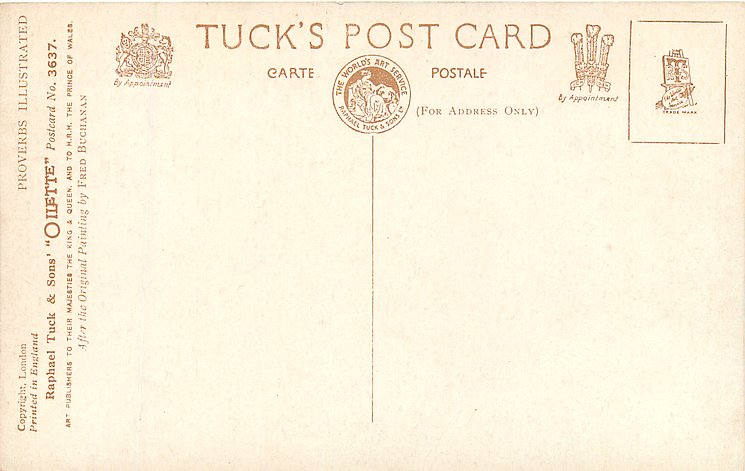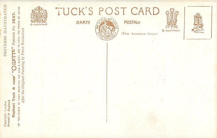 OILETTE, PRINTED IN ENGLAND, COPYRIGHT LONDON, PROVERBS ILLUSTRATED on front, 2 backs, AFTER ORIGINAL PAINTING BY FRED BUCHANAN, listed in 1930 POSTCARD Catalogue &1932 ART SERVICE Catalogue