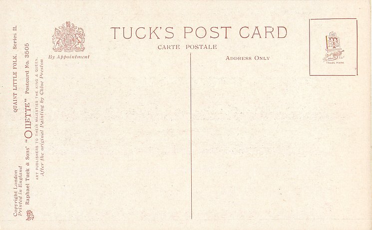 OILETTE, PRINTED IN ENGLAND, COPYRIGHT LONDON, 2 backs, AFTER THE ORIGINAL PAINTING BY CHLOE PRESTON, come with verses, listed in 1930 POSTCARD Catalogue &1932 ART SERVICE Catalogue