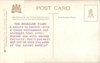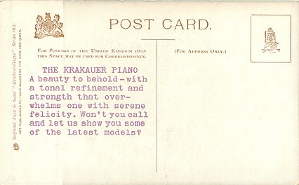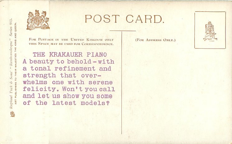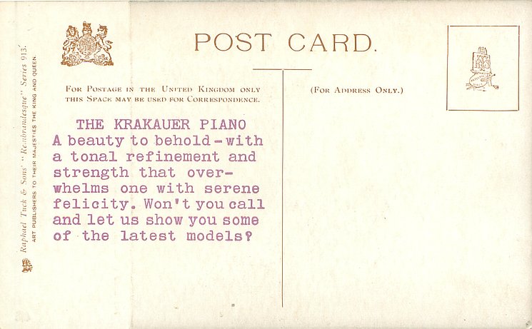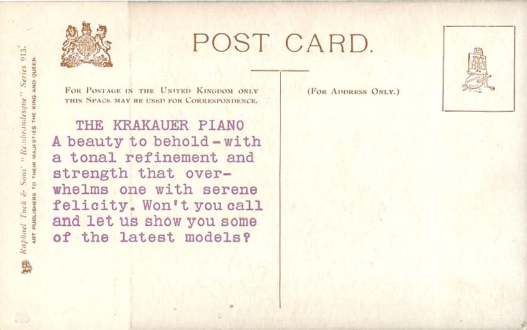 u/b or d/b, REMBRANDESQUE come with purple back advert KRAKAUER PIANO, A BEAUTY TO BEHOLD-WITH A TONAL REFINEMENT THAT OVER-WHELMS ONE WITH SERENE FELICITY. WON'T YOU CALL AND LET US SHOW YOU SOME OF THE LATEST MODELS?, listed in postcard catalogue 1908(USA)