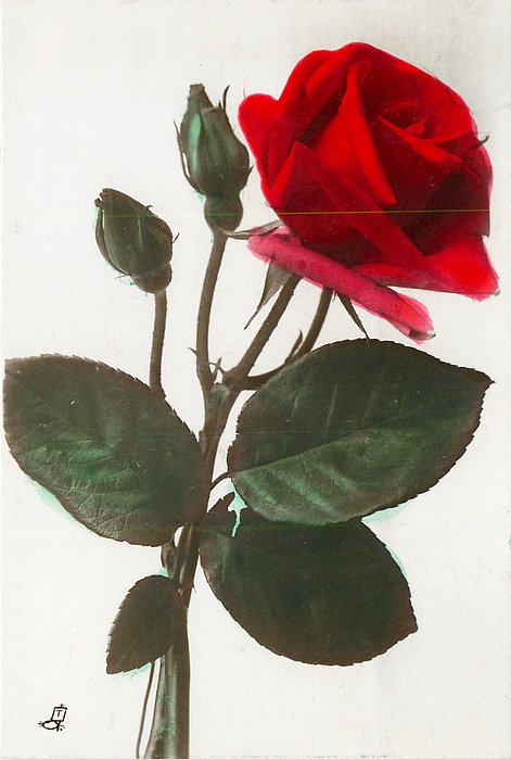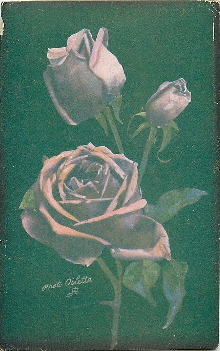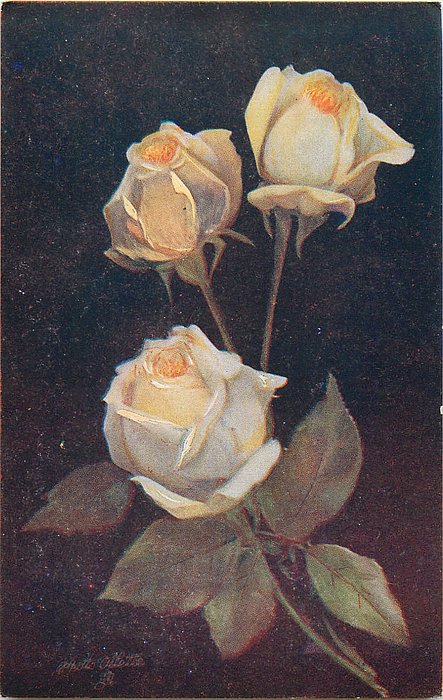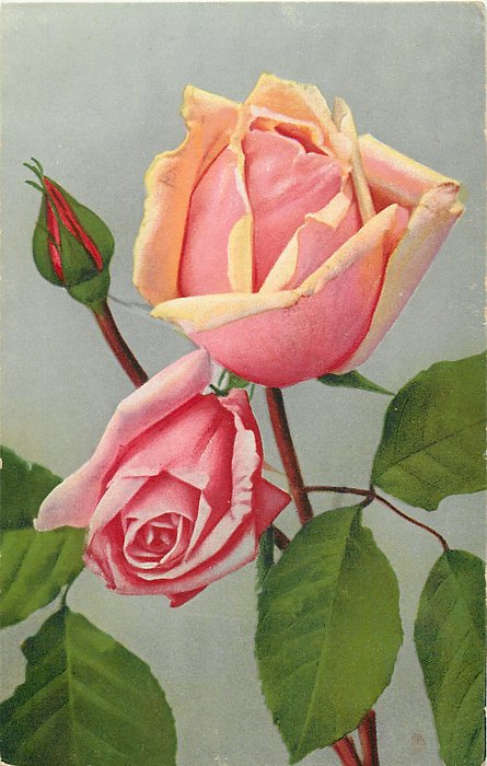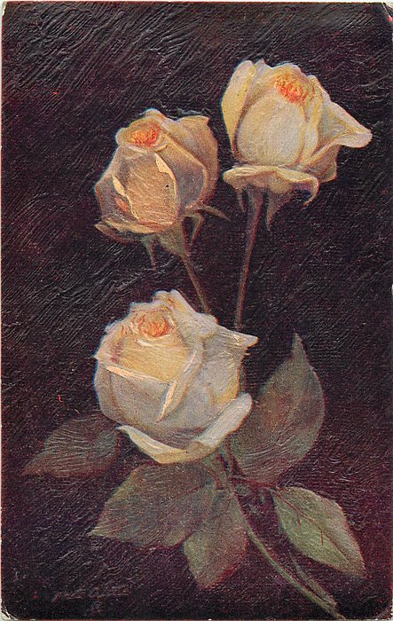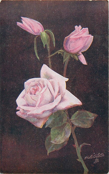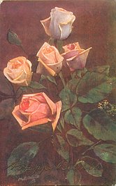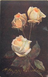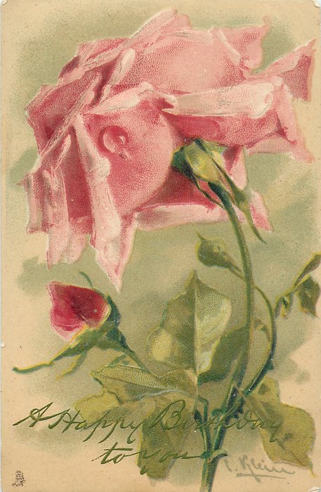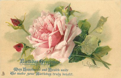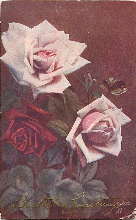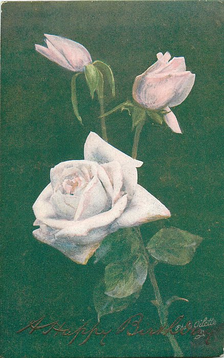 come pale pink roses on deep green background, A HAPPY BIRTHDAY opt. in gilt,