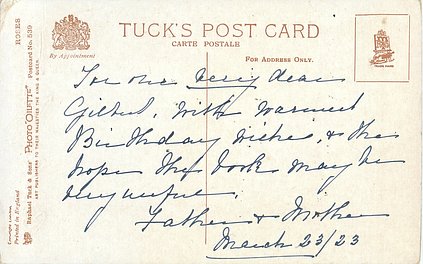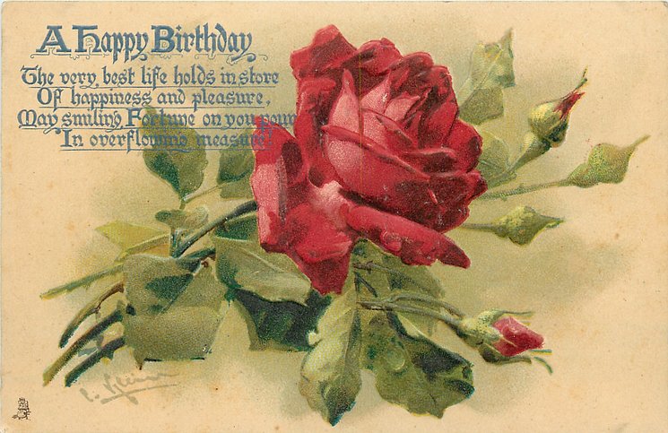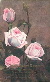 comes opt. in green BIRTHDAY GREETINGS & verse:- HAPPY RETURNS OF A HAPPY DAY, SO RUNS THE WISH THAT MY HEART WOULD SAY.