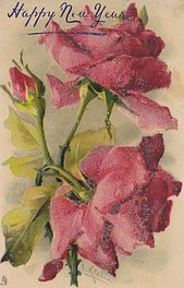 comes opt. in blue A HAPPY BIRTHDAY & verse:- THE VERY BEST LIFE HOLDS IN STORE OF HAPPINESS AND PLEASURE, MAY SMILING FORTUNE ON YOU POUR IN OVERFLOWING MEASURE!, comes opt. in brown & beaded WITH NEW YEAR GREETINGS