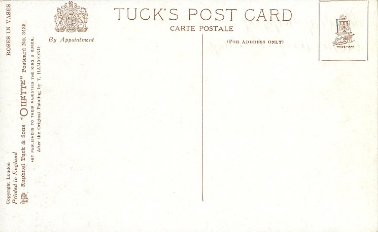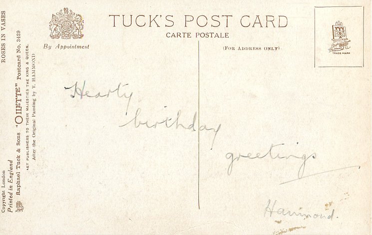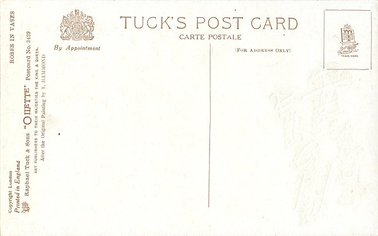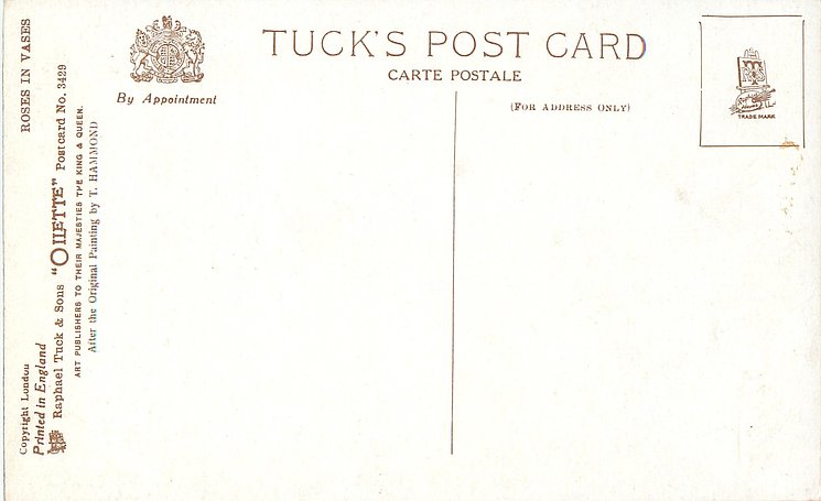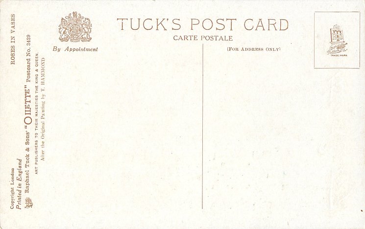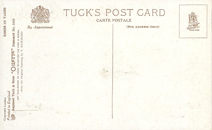 OILETTE, PRINTED IN ENGLAND, COPYRIGHT LONDON, come O/F but not so trade named, AFTER THE ORIGINAL PAINTING BY T. HAMMOND., come with various greetings