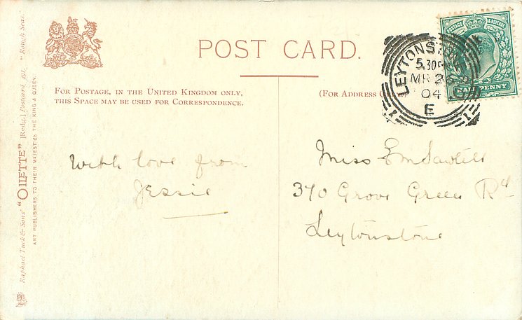 OILETTE, PRINTED IN ENGLAND, 2 backs, AFTER THE BLACK & WHITE ORIGINAL BY ELMER KEENE, listed in 1908/1909 & 1911/1912 & 1913/1914 Postcard Catalogues