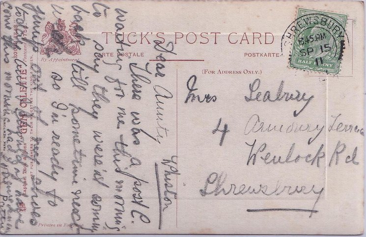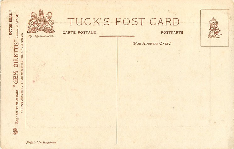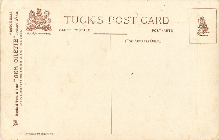 glossy, OILETTE, PRINTED IN ENGLAND, listed in 1908/1909 & 1911/1912 Postcard Catalogue, same basic images in 6309, 6343, 6649, 8551 & VIEW 825, listed in RAPHAEL TUCK & SONS' LD. CHRISTMAS & NEW YEAR 1904/1905 catalogue