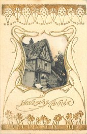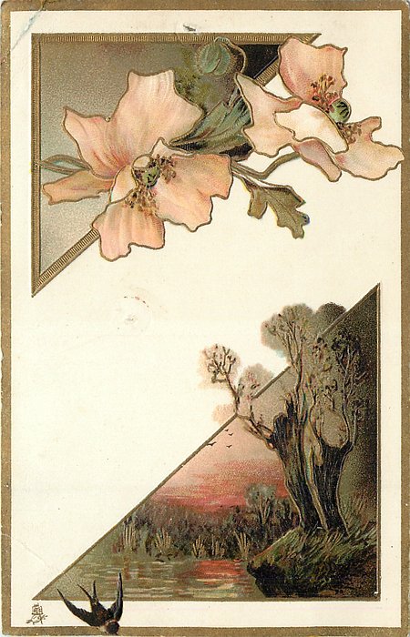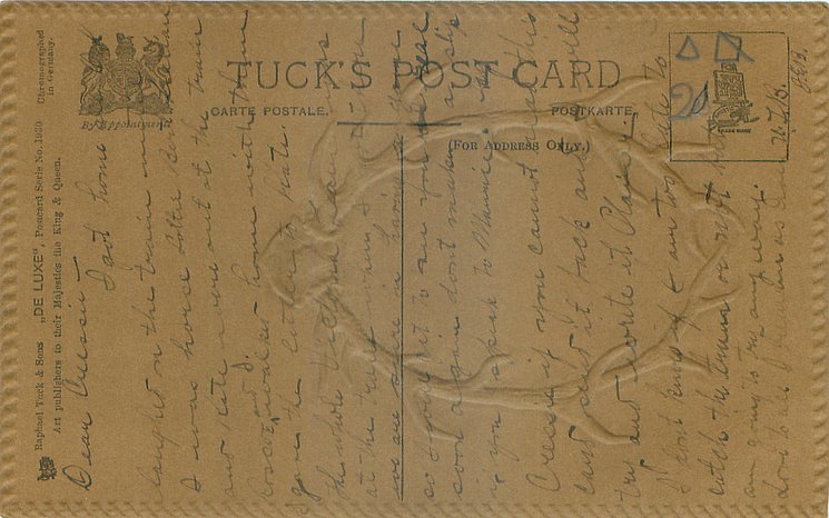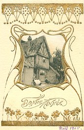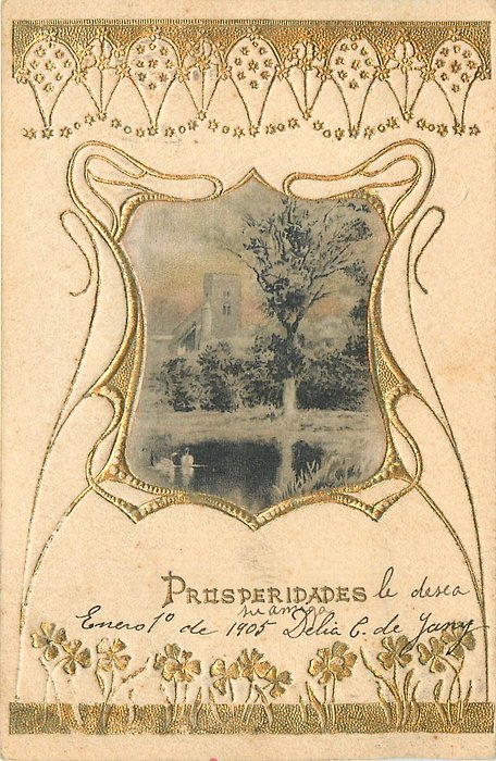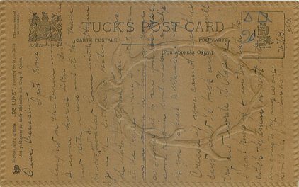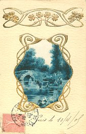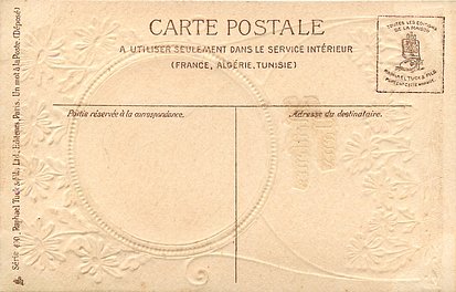 gilt embossed elaborate nouveau gilt decoration around irregular silk insets, UN MOT A LA POSTE, (DEPOSE)