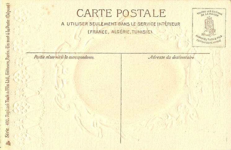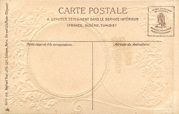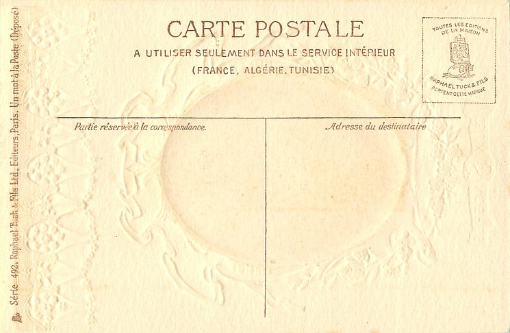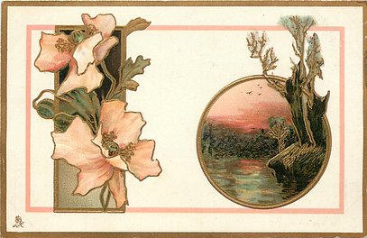 gilt embossed elaborate nouveau gilt decoration around circular silk insets, UN MOT A LA POSTE, (DEPOSE)