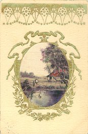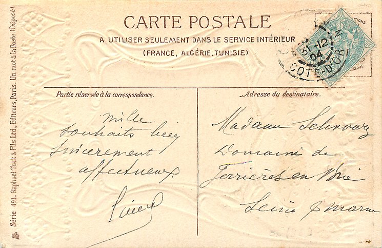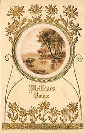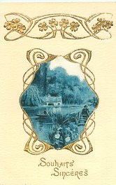 gilt embossed elaborate nouveau gilt decoration around oval silk insets, UN MOT A LA POSTE, (DEPOSE), vignettes come in green or purple