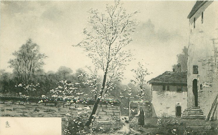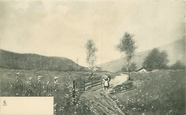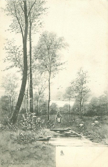 for mirror image, see previous card, comes opt. in green A HAPPY BIRTHDAY MAY GOOD FORTUNE MEET YOU AT EACH TURN AND WIND OF THE PATH BEFORE YOU SMILING, BLITHE, AND KIND