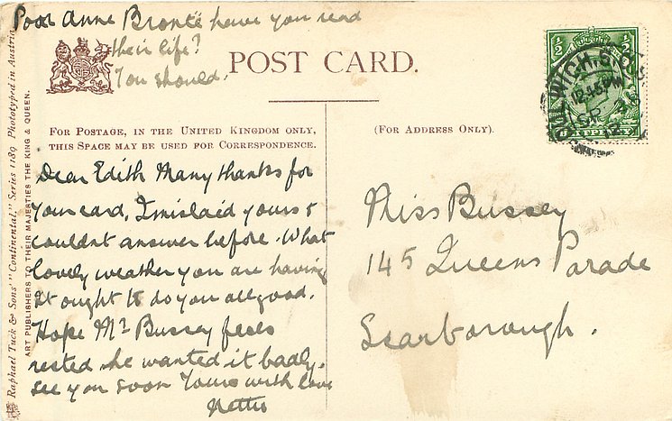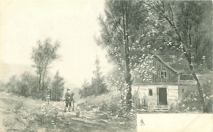 for mirror image, see next card, comes opt. in blue MANY HAPPY RETURNS "HAPPY DAYS TO YOU, AND MAY YOU E'ER BE FAVOURED BY GOOD FORTUNE"