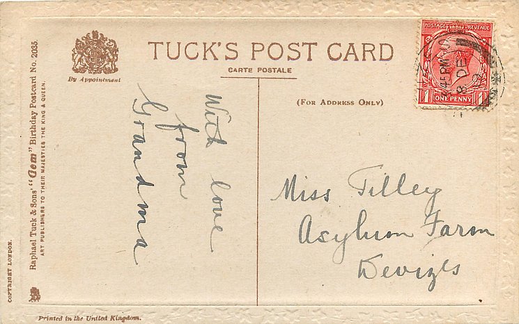 verse:- JUST A LITTLE CARD TO BRING MY LOVE TO YOU AND SAY THAT HAPPY THOUGHTS AND FANCIES WING THEIR FLIGHTTO YOU TO-DAY