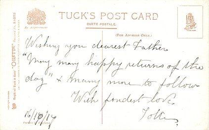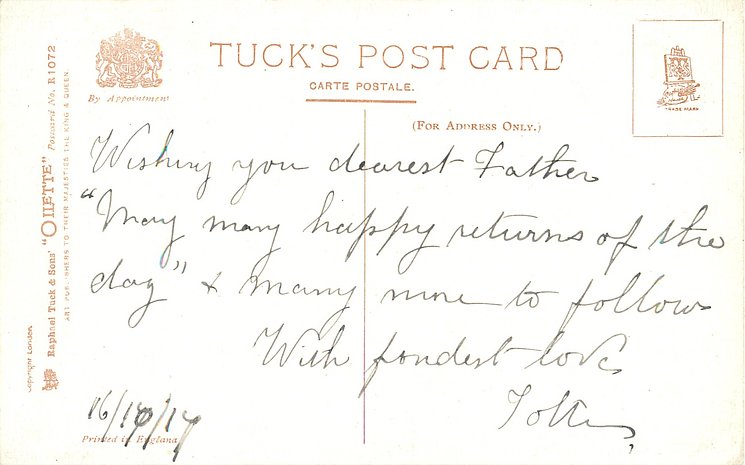 gilt embossed card titles, CHROMOGRAPHED IN BAVARIA, SATIN POSTCARD POSTAGE 1D. (in stamp box)