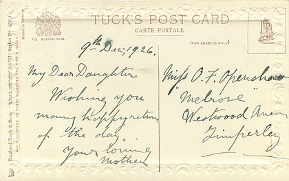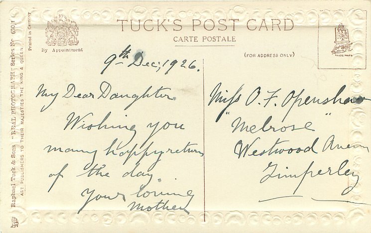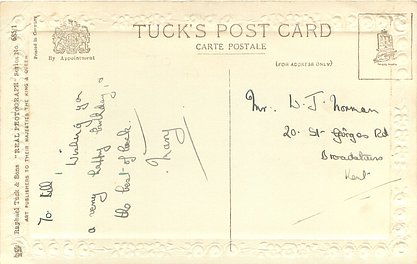 verse:- OH, MAY MY SUNNY WISHES LEND SOME BRIGHTNESS TO THE CARD I SEND SO MAY YOU FEEL MORE GLAD AND GAY WHEN IT REACHES YOU TO-DAY