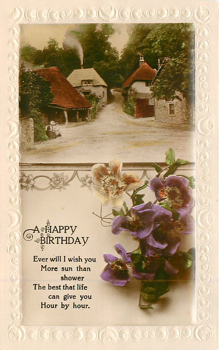 verse:- THIS DAINTY CARD COMES TO CONVEY MY WISH FOR YOU THIS HAPPY DAY; MAY FORTUNE STREW YOUR PATH WITH FLOWERS, AND BRING YOU SUNNY HOURS