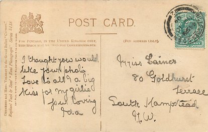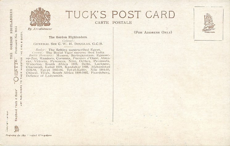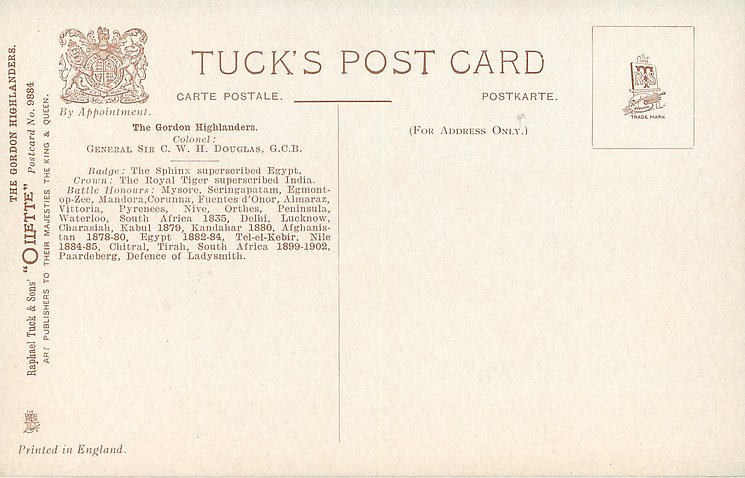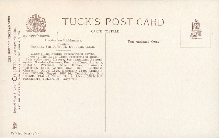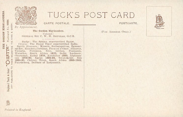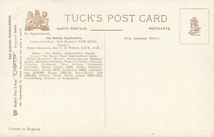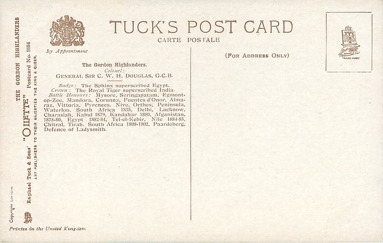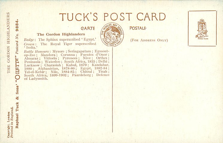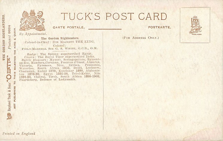 5 backs, OILETTE, PRINTED IN ENGLAND, with or w/o COPYRIGHT LONDON, listed in 1911/1912 & 1913/1914 Postcard Catalogues, this set was also sold at 1924 Wembley Exbn, see Perkins & Tonkin, PRINTED IN THE UNITED KINGDOM, come oilfacsim but not so tradenamed
