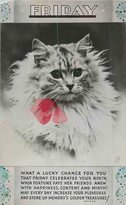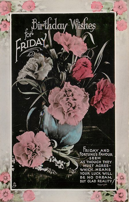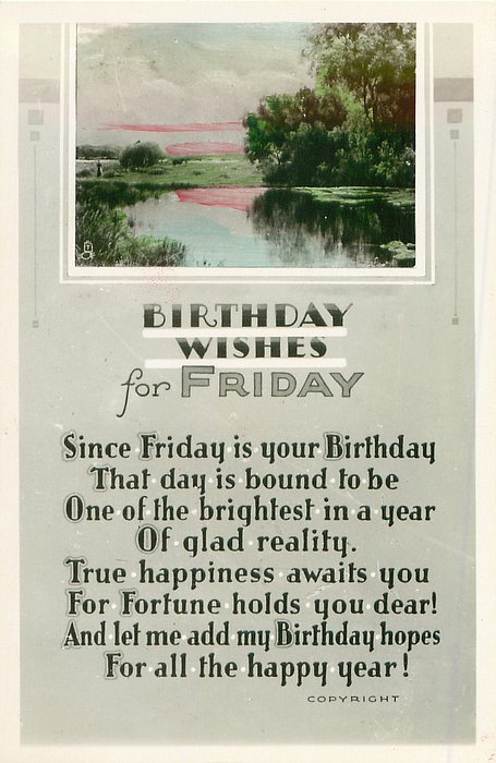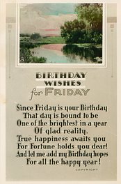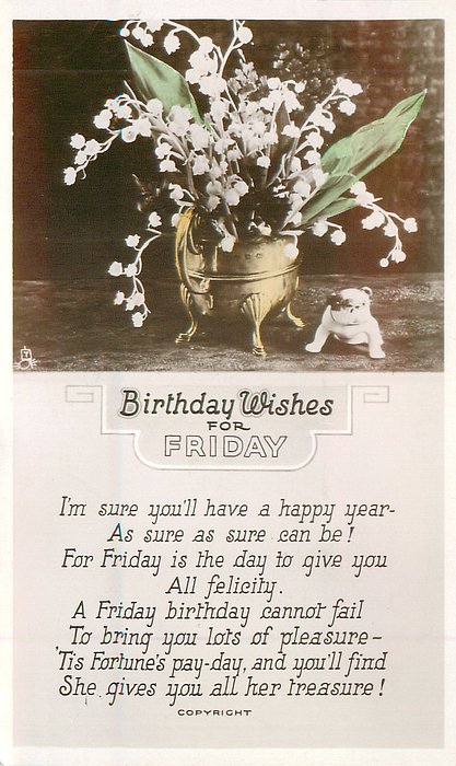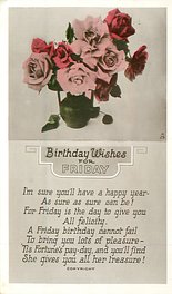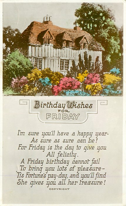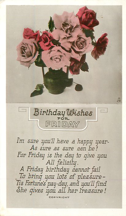 verse:- I'M SURE YOU'LL HAVE A HAPPY YEAR-AS HAPPY AS SURE CAN BE! FOR FRIDAY IS THE DAY TO GIVE YOU ALL FELICITY. A FRIDAY BIRTHDAY CANNOT FAIL TO BRING YOU LOTS OF PLEASURE- 'TIS FORTUNES PAY-DAY AND YOU'LL FIND SHE GIVES YOU ALL HER TREASURE!
