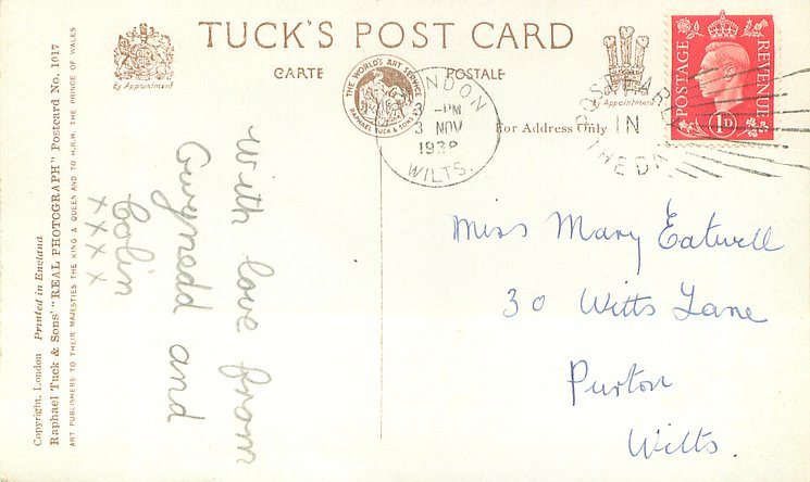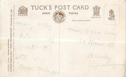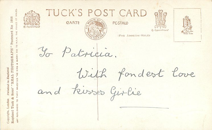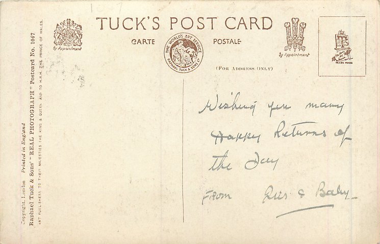 REAL PHOTOGRAPH, PRINTED IN ENGLAND, COPYRIGHT LONDON, cards 1015, 1016, 1017 have identical wording but different floral insets