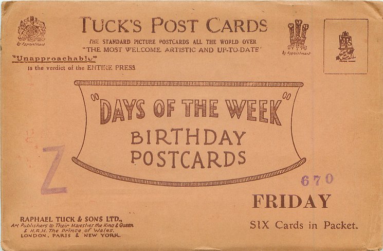 6 identical cards sold in packet hand-stamped 670, "DAYS OF THE WEEK" BIRTHDAY POSTCARDS