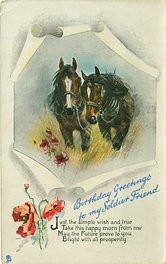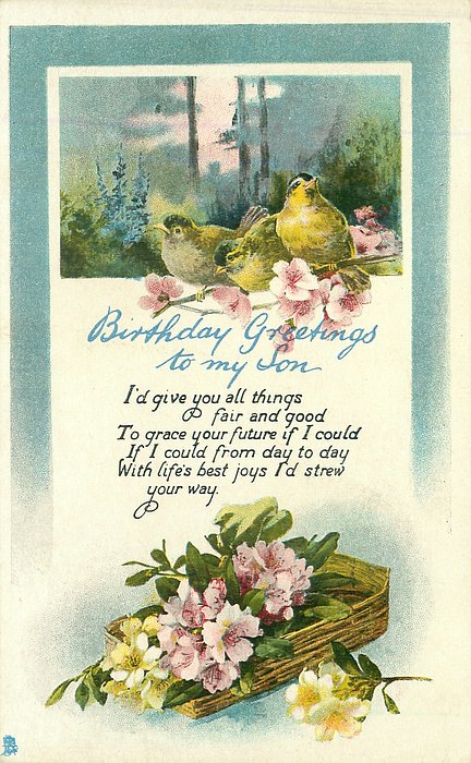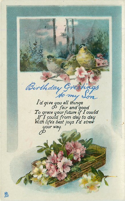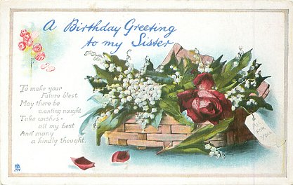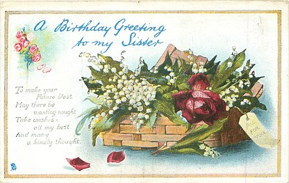 verse:- I NE'ER FORGET TO WISH YOU WELL-THESE FLOWERS OF SUNNY HUE I SEND THIS HAPPY DAY TO TELL, MY KINDLY THOUGHTS OF YOU. MAY FLOWERS CHEER THE WAY YOU TREAD AND SKIES OF BLUE BEND OVERHEAD same image & inscriptions without reference to friend 1301