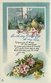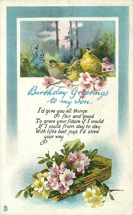 verse:- WELCOME TO THE HAPPY DAY OF LOVE AND MIRTH AND FUN AND PLAY I'M HOPING IT MAY HOLD FOR YOU MANY PLEASURES SWEET AND NEW I SEND MY LOVE AND WISH THAT ALL THAT'S GLAD AND BRIGHT TO YOU BEFALL same image & inscriptions without reference to Family member 1316