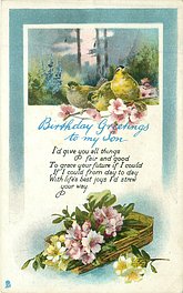 verse:- WHATEVER YOU LACK OF PLEASURE'S STORE OR HEALTH OR LOVE, OR GOLD MAY FORTUNE BRING IT TO YOUR DOOR BEFORE THE DAY IS OLD Birds -Buntings