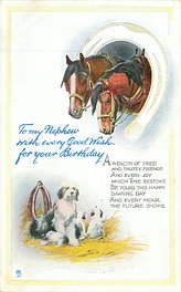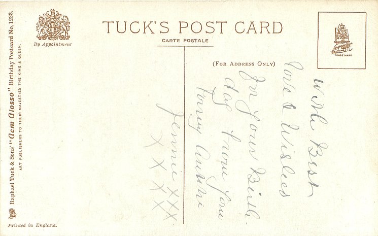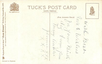 verse:- MY GREETING CARD COMES DULY TO PROVE TO YOU HOW TRULY MY MEMORY HOLDS YOU DEAR, YOUR HEART BE OF THE LIGHTEST YOUR LOT BE OF THE BRIGHTEST FOR MANY A COMING YEAR same image & inscriptions without reference to Family member 1316