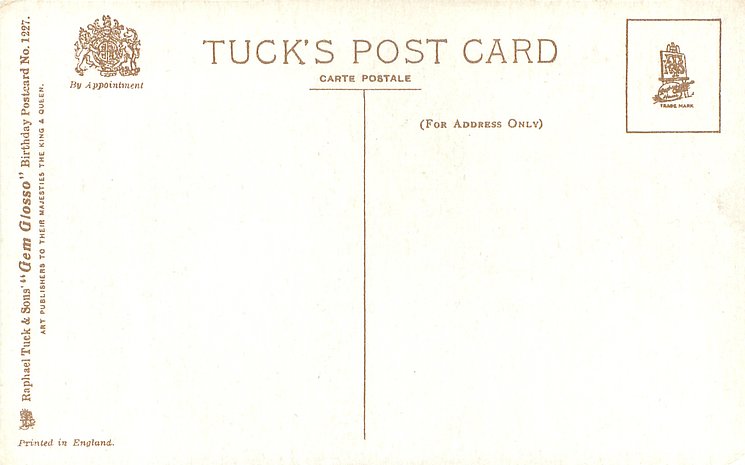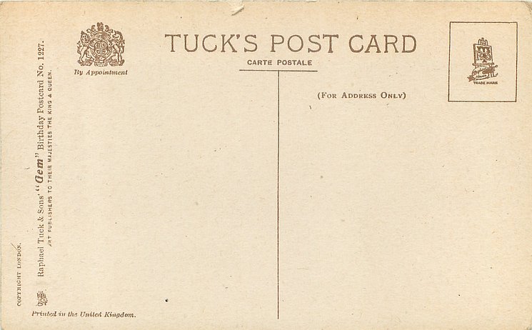 GEM, PRINTED IN THE UNITED KINGDOM, COPYRIGHT LONDON on cream stock or GEM GLOSSO, PRINTED IN ENGLAND on white stock, some cards trade-named GEM GLOSSO come plain despite the trade-name, same image Birthday 1302, Christmas C 7402 & New Year N 7402