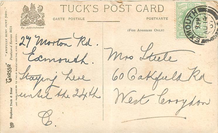GLOSSO, listed as TOO BUSY TO WRITE in 19121911/1912 Postcard Catalogue, this set uses same images and inscriptions as 5270, comes hand-coloured, with or w/o PRINTED IN ENGLAND