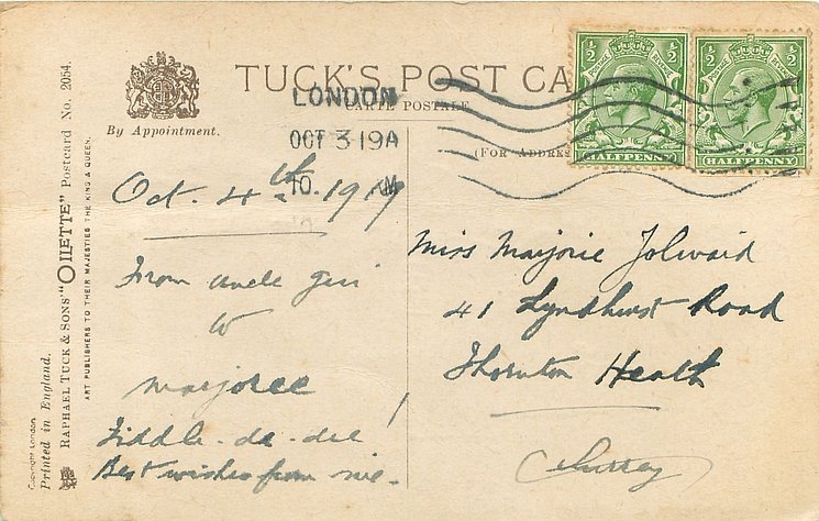 OILETTE, PRINTED IN ENGLAND, COPYRIGHT LONDON, 2 backs, same images with Xmas greetings 7544
