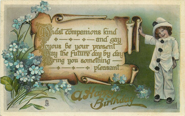 verse:- MIDST COMPANIONS KIND AND GAY JOYOUS BE YOUR PRESENT MAY THE FUTURE DAY BY DAY BRING YOU SOMETHING PLEASANT.