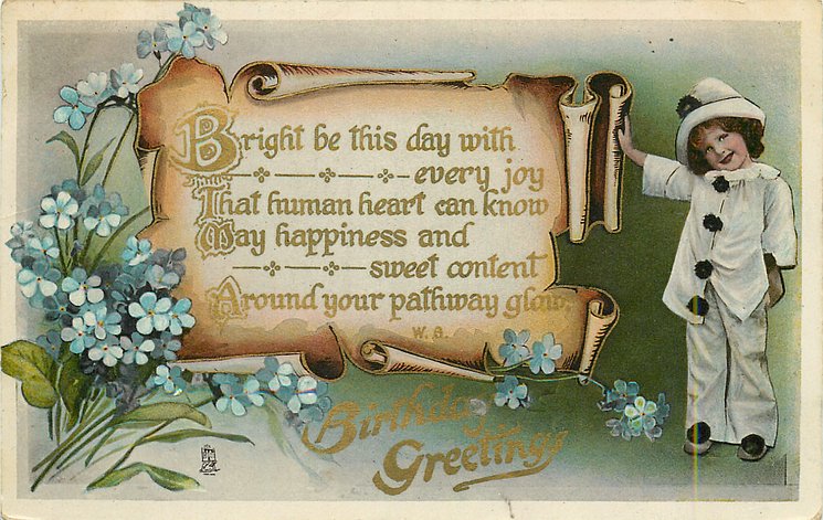 verse:- ALL LOVING WISHES FROM MY HEART I SEND YOU WITH THIS GREETING, MAY EACH NEW DAY BE GLAD AND GAY WITH MANY A MERRY MEETING