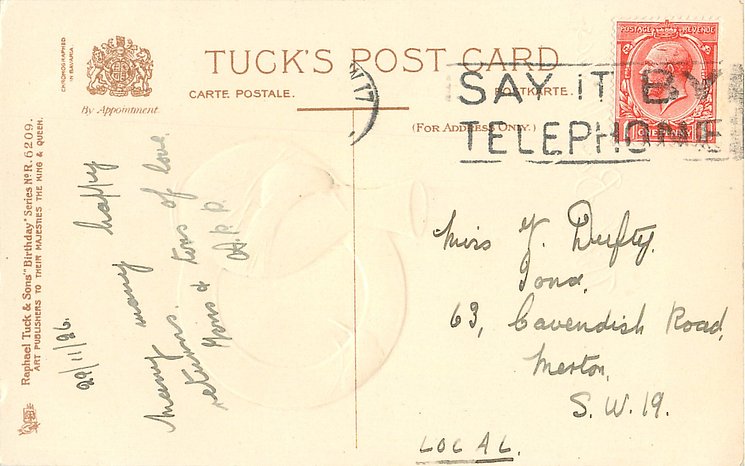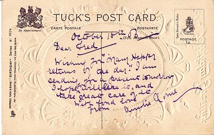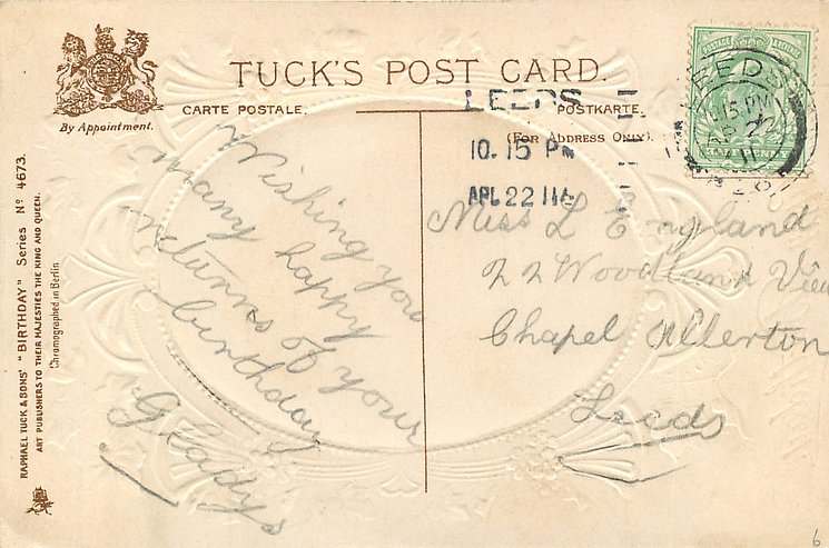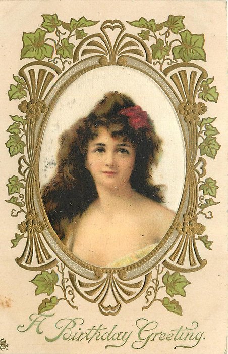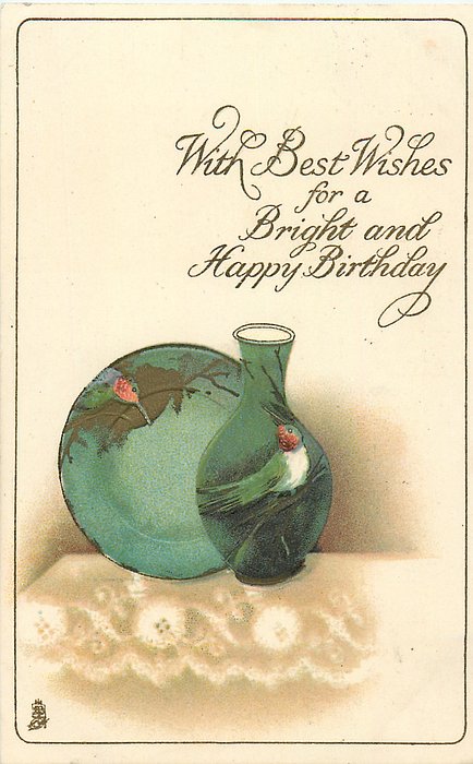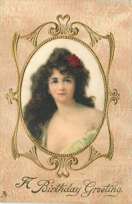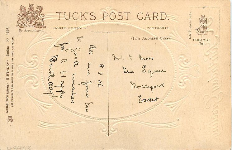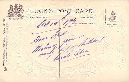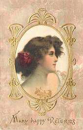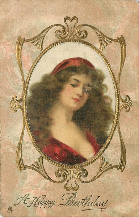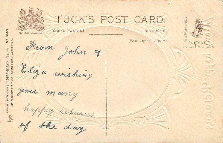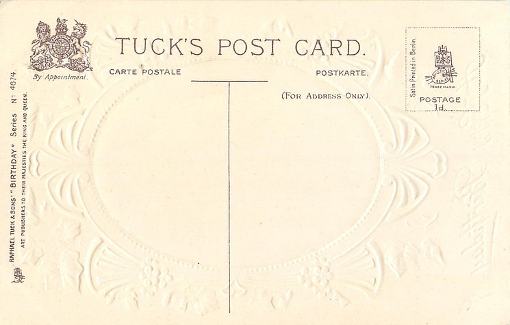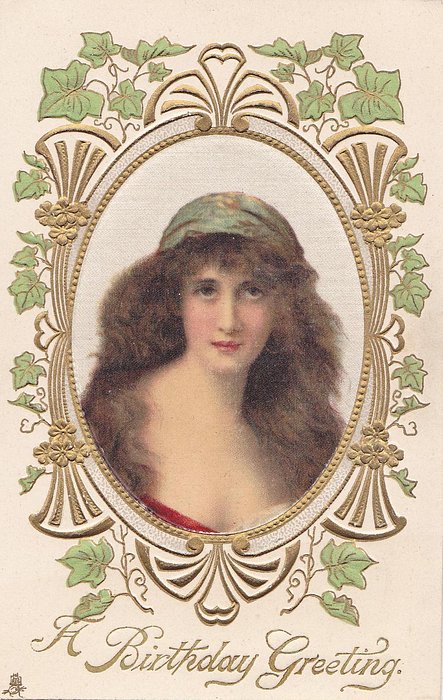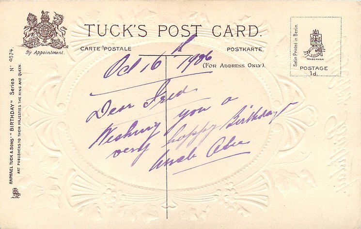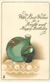 unnumbered, no prefix, divided back, embossed, many with gilt inscriptions, PRINTED IN GERMANY or PRINTED IN SAXONY or CHROMOGRAPHED IN SAXONY, come glittered several cards used as Advertising cards opt in brown COMPLIMENTS AND BEST WISHES OF THE HEYDT BAKERY MAY YOU LIVE LONG AND ENJOY EATING YANKEE BREAD, many of the same images BIRTHDAY 105 & unnumbered Birthday floral