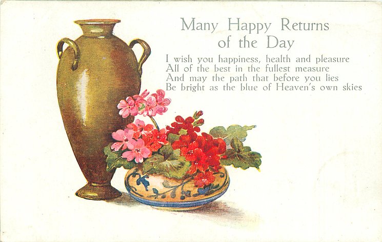 verse:- I WISH YOU HAPPINESS, HEALTH AND PLEASURE ALL OF THE BEST IN FULLEST MEASURE AND MAY THE PATH THAT BEFORE YOU LIES BE BRIGHT AS THE BLUE OF HEAVEN'S OWN SKIES.
