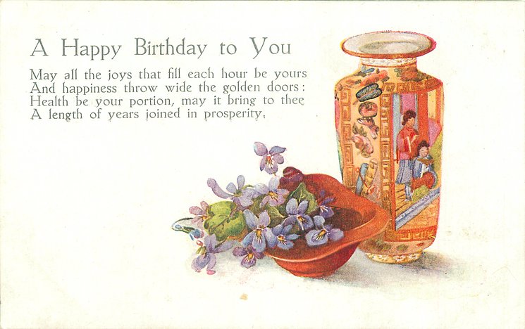 verse:- MAY ALL THE JOYS THAT FILL EACH HOUR BE YOURS AND HAPPINESS THROW WIDE THE GOLDEN DOORS: HEALTH BE YOUR PORTION, MAY IT BRING TO THEE A LENGTH OF YEARS JOINED IN PROSPERITY.