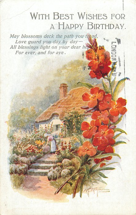 verse:- MAY GENTLE WORDS AND SUNNY SKIES ENCIRCLE ALL LIFE'S WAY AND CROWDS OF HAPPY MEMORIES BE YOURS THROUGHOUT THIS DAY set number partially rubbed off