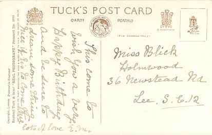 verse:- SATURDAY SUNSHINE AND SONG,-GOOD OMENS FOR TO-DAY! THERE WILL BE BRIGHTNESS ALL ALONG YOUR VERY HAPPY WAY! same image & inscriptions on card without floral borders card 1041