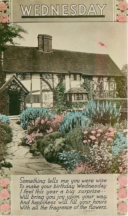 verse:- WEDNESDAY, WONDERFUL AND WEALTH ARE WORDS THAT SPRING TO MIND. I'M SURE IT MEANS THAT LUCK AND HEALTH AND HAPPINESS YOU'LL FIND!