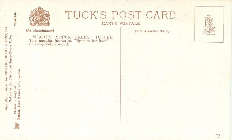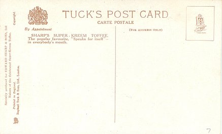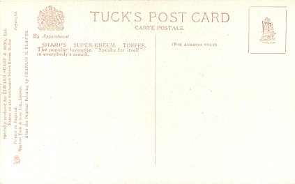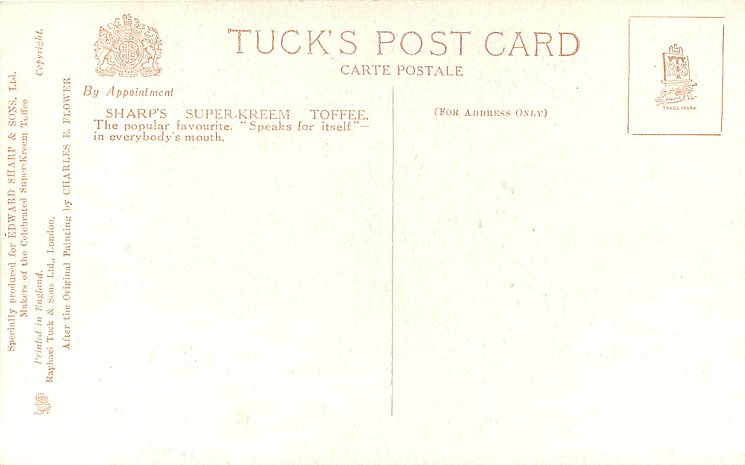 COPYRIGHT, PRINTED IN ENGLAND SPECIALLY PRODUCED FOR EDWARD SHARP & SONS, LTD. MAKERS OF THE CELEBRATED SUPER KREEM TOFFEE . AFTER THE ORIGINAL PAINTING BY CHARLES E. FLOWER , comes with five slightly different backs see Perkins & Tonkin
